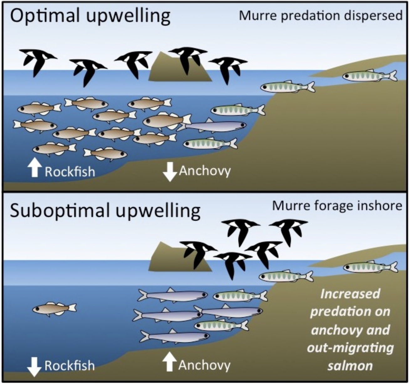 The common murre is a seabird that breeds in large numbers off the coast of California. In spring, pairs of murres raise one chick by bringing it juvenile fish, including rockfish, anchovy, and salmon. The composition of common murre diets on the Farallon Islands (~30 miles west of San Francisco) has been recorded by biologists with Point Blue Conservation since the 1970s.