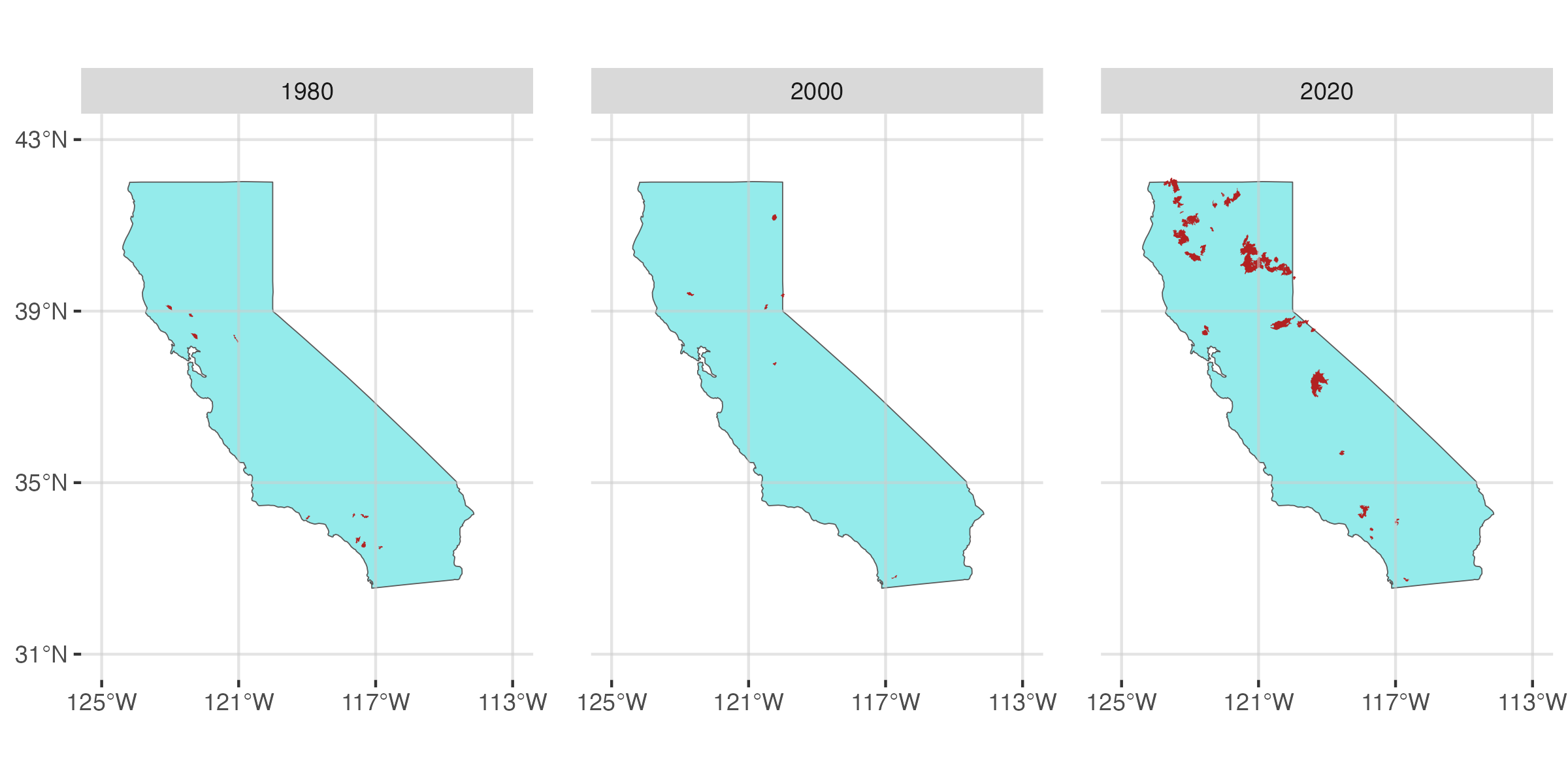 Figure 3: Maps of wildfires in 1980, 2000, and 2020.